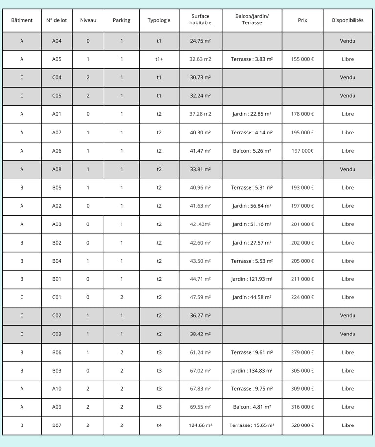 Du T1 au T4, les appartements ont été conçus pour répondre aux attentes actuelles en matière de confort et de qualité de vie. Les espaces intérieurs bénéficient d’agencements fonctionnels et lumineux, favorisant une circulation fluide entre les pièces de vie. Chaque logement dispose également d’un espace extérieur privatif : balcon, terrasse ou jardin , permettant de profiter pleinement de l’environnement calme et verdoyant de la résidence.
